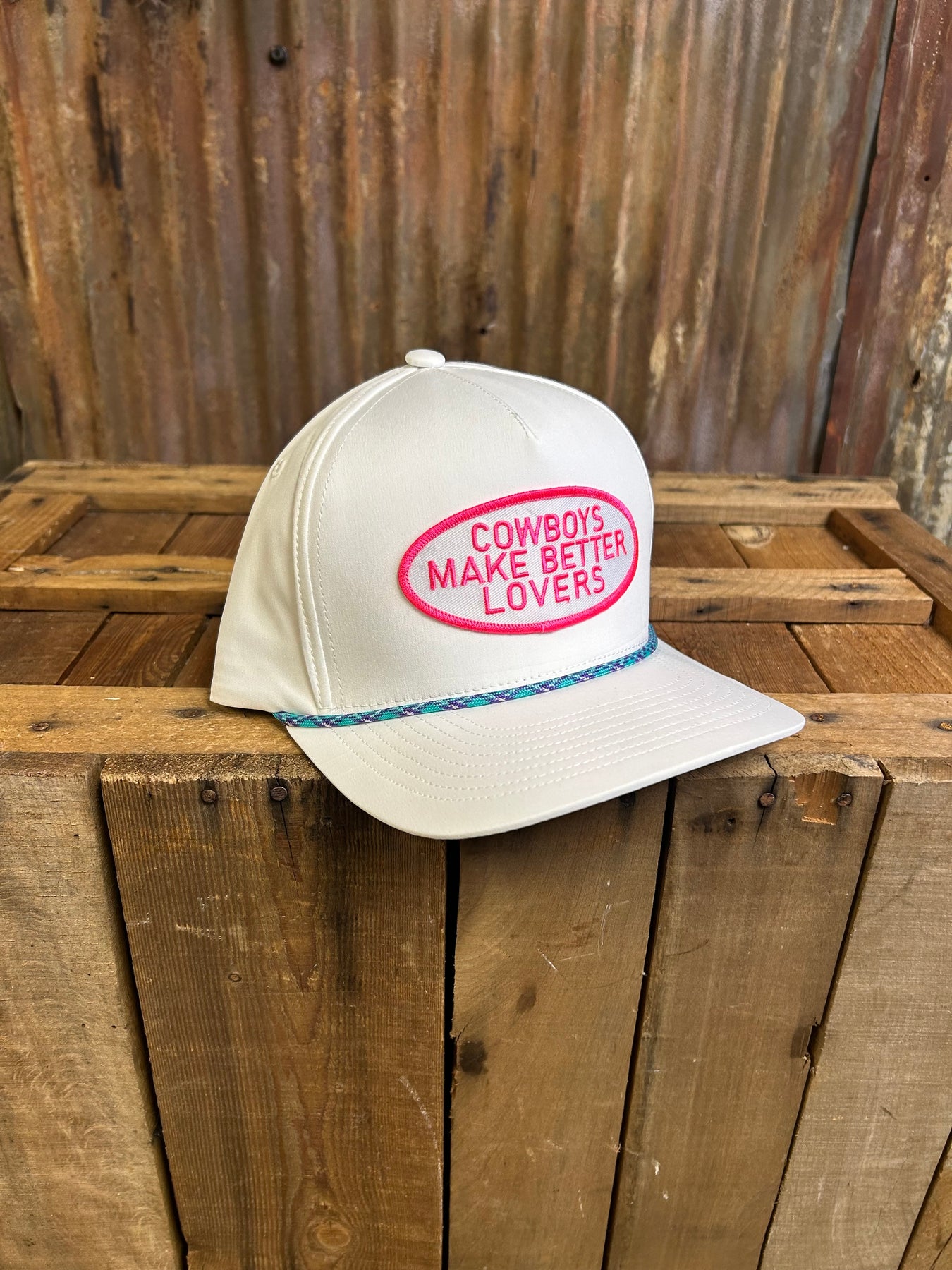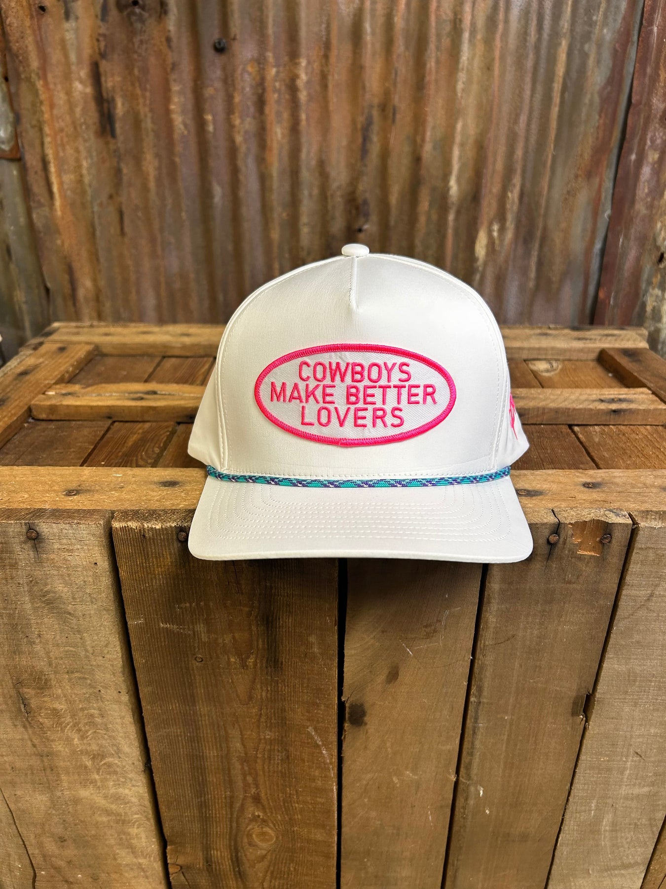 White Snapback Cap with Purple and Turquoise Rope