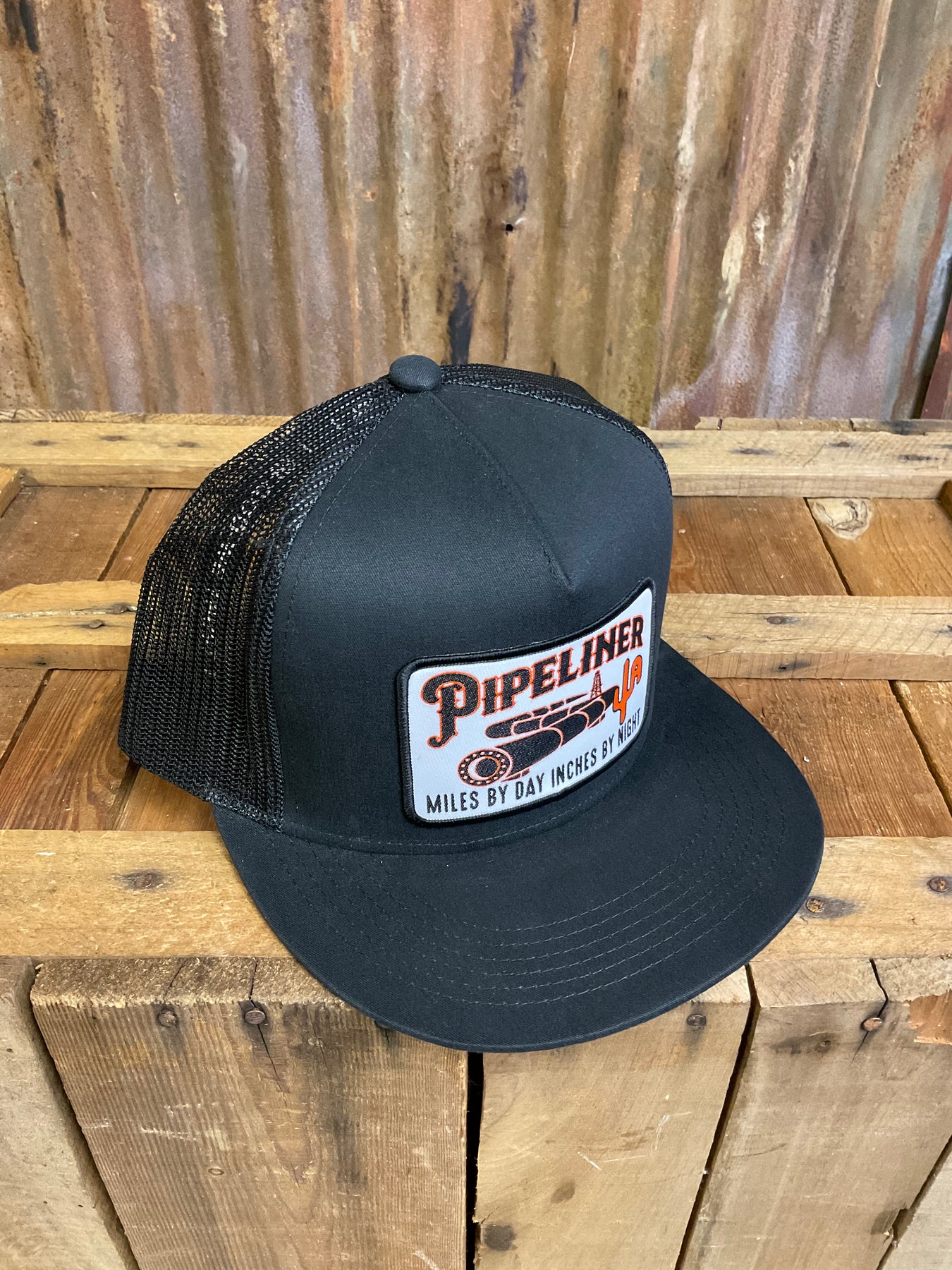 5 panel, 6006 style snapback hat in black with black mesh featuring our "Pipeliner" patch!