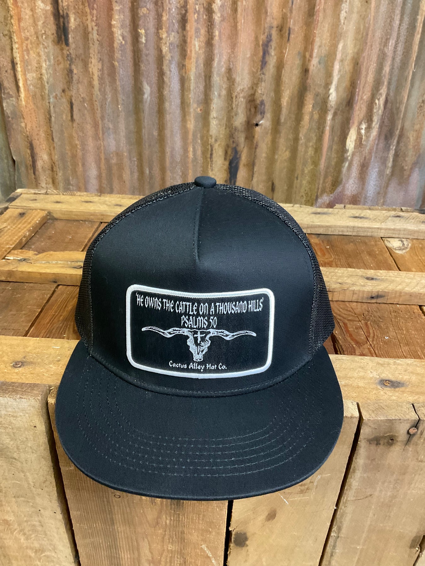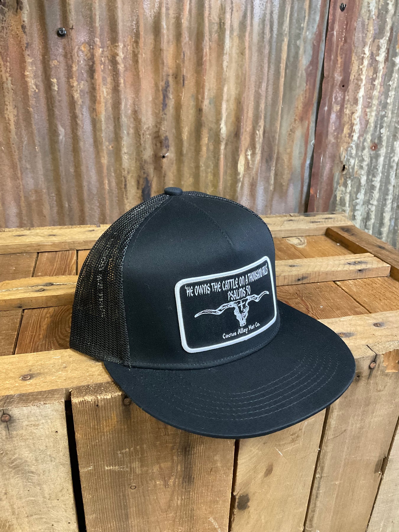 5 panel, 6006 style snapback hat in black with black mesh featuring our "Psalms 50" patch!