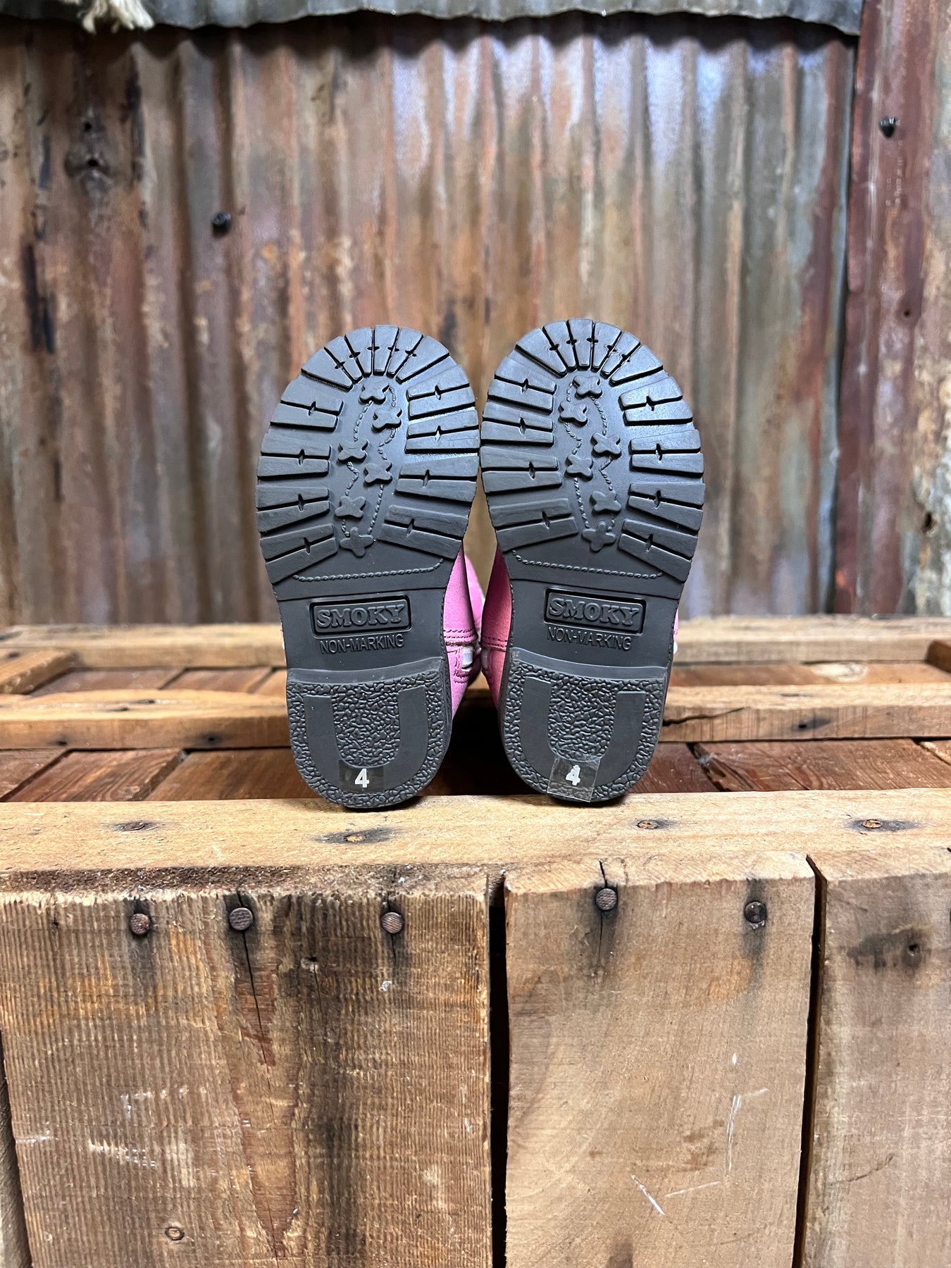Hey Cowgirl! These toddler girl's western Hopalong boots from Smoky Mountain Boots have a side zip closure and are made of leather with a pink shaft. They have a tricot lining with a U round toe, a walking heel, and a TPR outsole. Leather.
