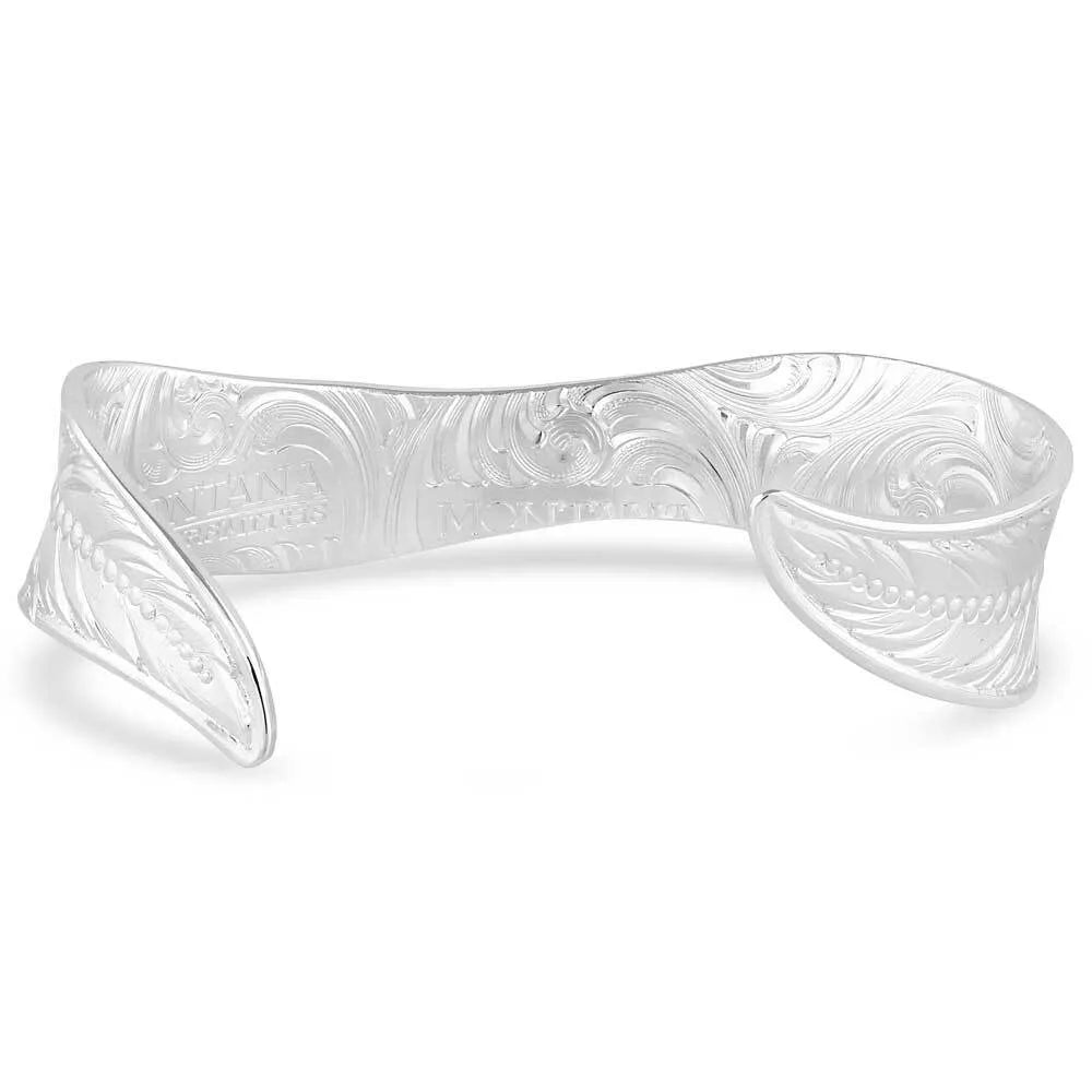 Turn heads with this stunning silver tone bracelet that is American made. Crafted in a delicate feather design this slender bracelet is detailed with intricate flourishes to create movement and flow. From the graceful curving shape to the bright silver design this bracelet is a wonderful way to lend flair and interest to an outfit. One size fits most.