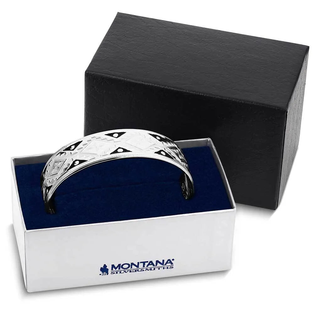 Embrace the spirit of the West with the Darling of the West Bracelet. This cuff bracelet features a striking silver tone geometric design defined by black hand painted triangles. Wear this cuff alone or stack it with your favorites. One size fits most.