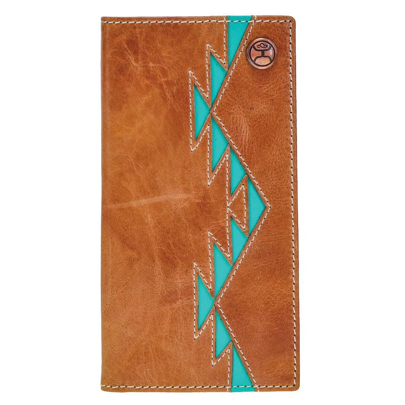This Hooey rodeo wallet features a tan exterior detailed with turquoise Aztec inlay & ivory accent stitching, a tan interior, and includes our custom hooey brand woven logo liner.
