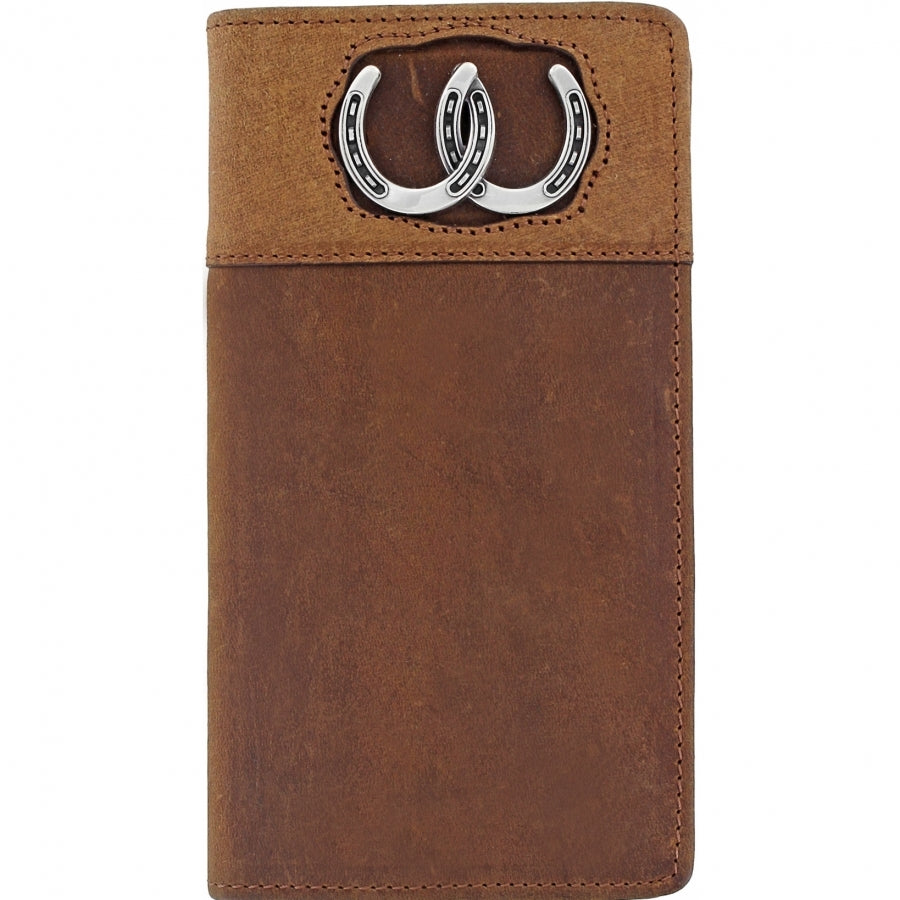 Carry this checkbook wallet, with two horseshoes, and bring extra luck to your pocket. The silver-plate ornaments recall the West, while its practical compartments fit cards, checkbook, a pen, id, and more