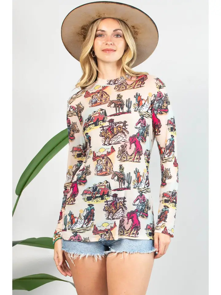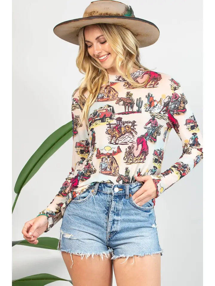 Avery Vintage Western Print Semi Sheer Mesh Top