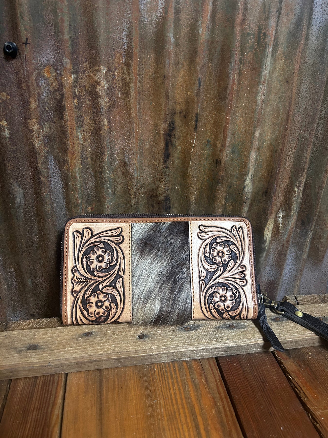 Challenger Hair on Hide Tooled Wallet/Wristlet