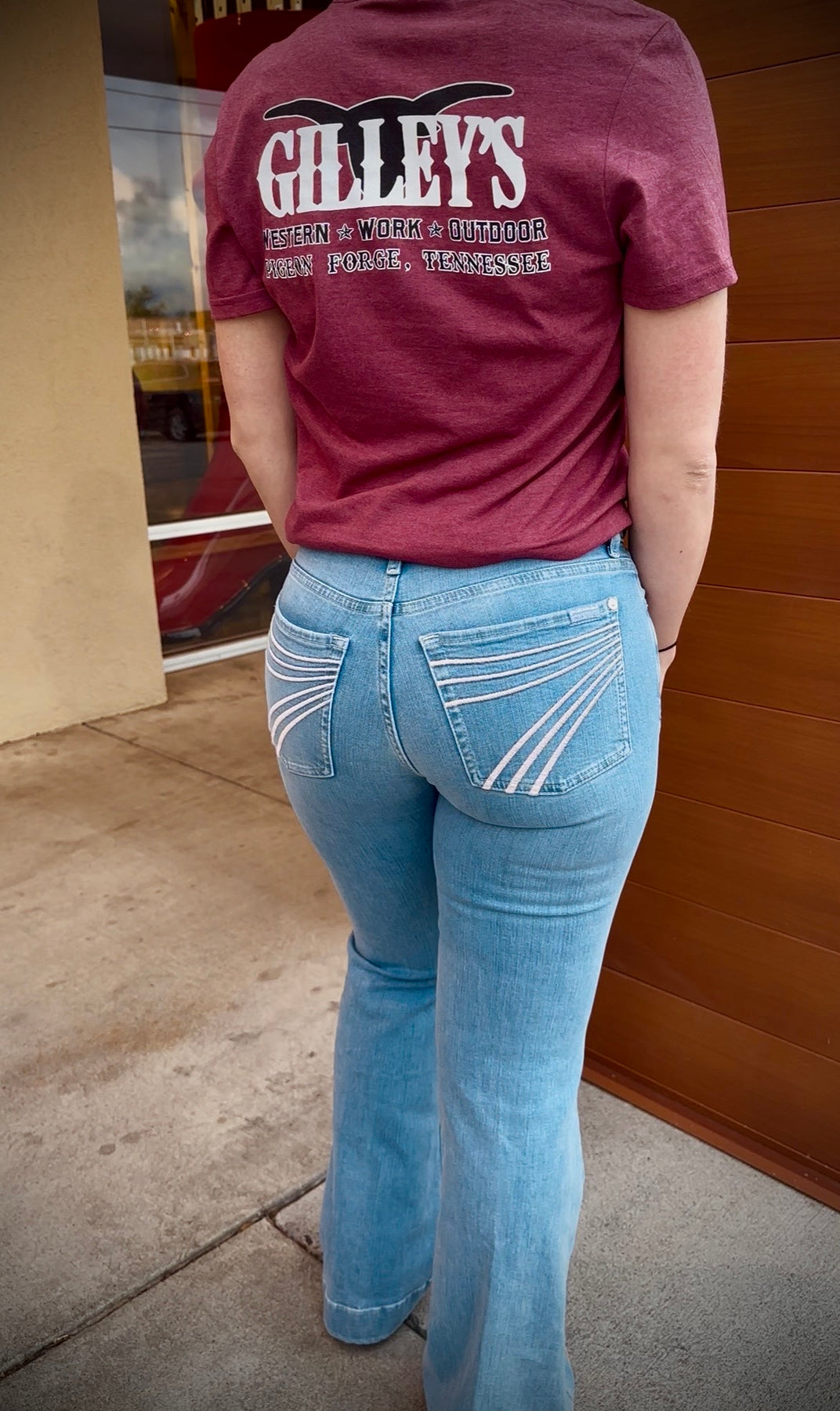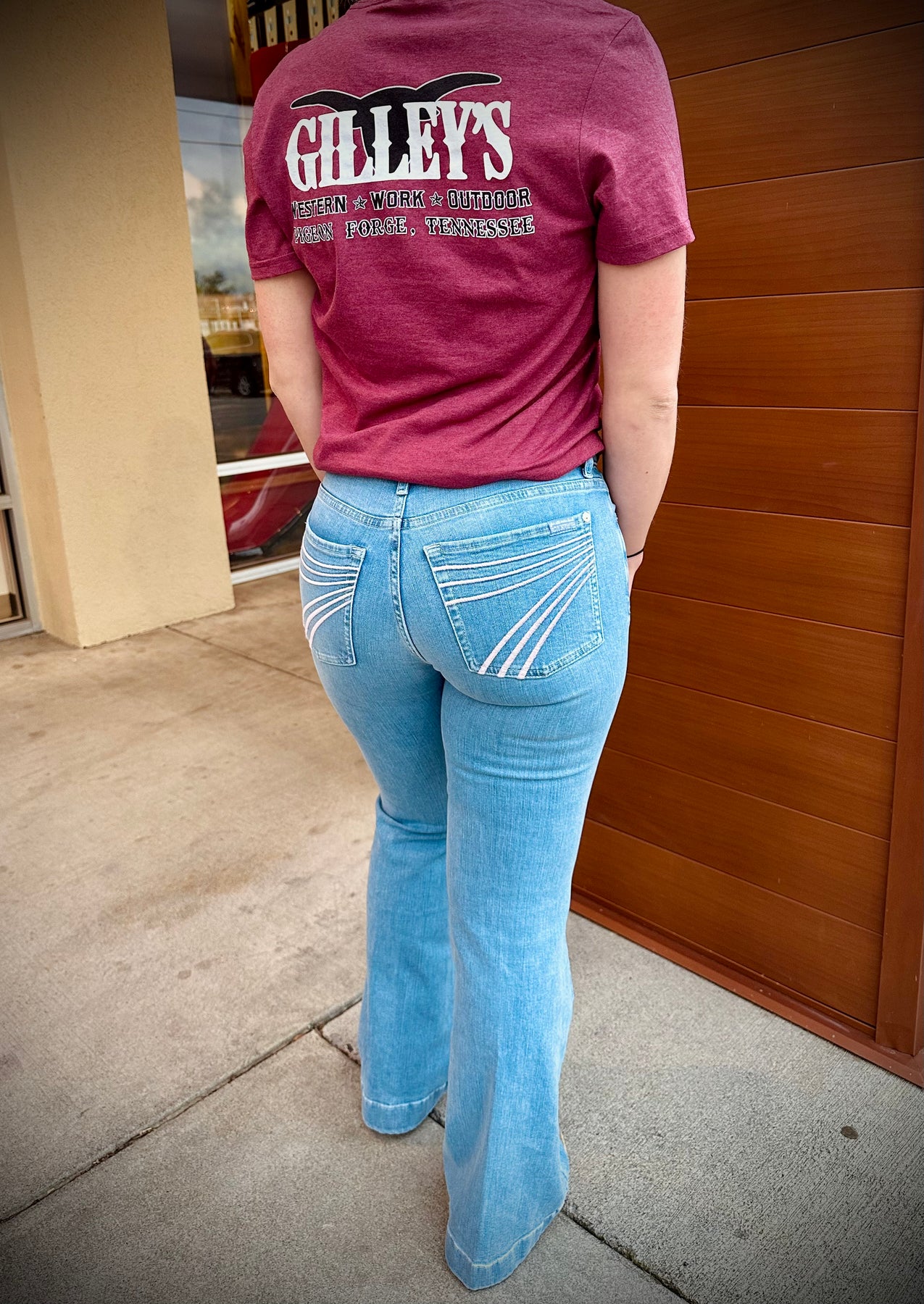 Fits like: Fitted through the hips and thighs. This mid rise denim has a wide, full-length leg and a subtle flare for a long, lean silhouette.
