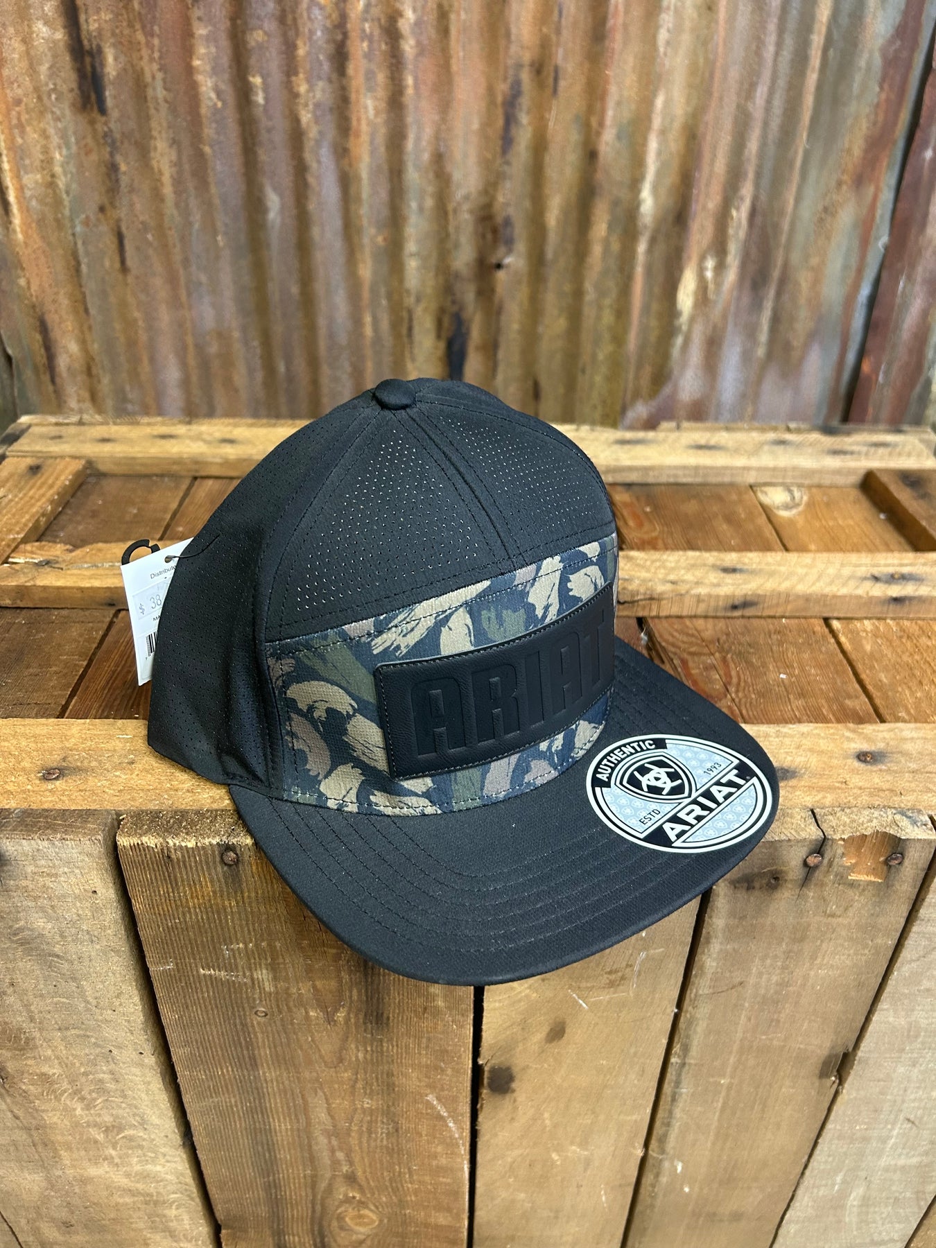 Ariat mens cap by M&F Western Products. Brush stroke camo on the front panel and a black bill. Debossed Ariat patch on front and an Embroidered Ariat shield on the side. Black performance mesh back with a snap back closure for that perfect fit.