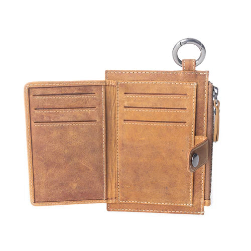 Embrace minimalist Western style with this compact card keeper, featuring authentic hair-on hide framed by desert-worn leather. Perfect for the modern trail blazer, this mini-wallet combines ranch-inspired design with city sophistication. The secure snap closure and handy key ring keep your essentials close at hand.